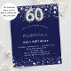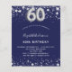 A modern, stylish and glamourous invitation for a 60th birthday party. A navy blue background, decorated with faux silver stars. Personalize and add your name and party details. Number 60 is written with a balloon style font.