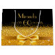 Elegant, classic, glamourous and feminine style party gift bag. A gold coloured ribbon and bow with golden glitter and sparkle, a bit of bling and luxury for a birthday. Black background. With templates for name, age, date of birth and date of anniversay.