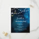A romantic invite card for a 60th birthday party . A dark and blue evening and night with a full moon and string lights. Two rustic painted mason jars with candles. Templates for date, name, eventplace, and RSVP details. The name is written with a modern hand lettered style script. White letters.