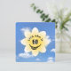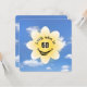 White flower graphic with glowing sunshine, smile, and eyeballs on a blue summer sky background for a 60th birthday party.