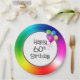 Bold neon abstract rainbow design with party ballons for a 60th birthday party.