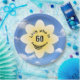 White flower graphic with glowing sunshine, smile, and eyeballs on a blue summer sky background for a 60th birthday party.