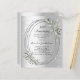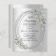 A faux silver looking background. Decorated with greenery, an oval frame and faux diamonds. Personalize and add a name and details.