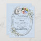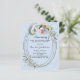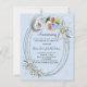 A light blue background. Decorated with greenery, an oval frame and faux diamonds. Personalize and add a photo, names and details.
