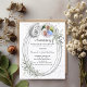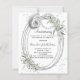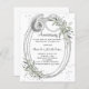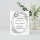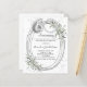 A white background. Decorated with greenery, an oval frame and faux diamonds. Personalize and add a photo, names and details.