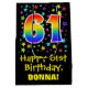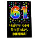 This exciting, colourful, and vibrant birthday giftbag design features a large number "61" with a rainbow spectrum gradient inspired pattern, along with the message "Happy 61st Birthday,", and a personalized recipient name. It also has a colourful background pattern featuring variously-sized star shapes. A gift bag like this might be used when giving a gift or present in honour of somebody’s 61st birthday. [~Z0000510]