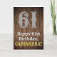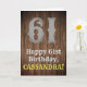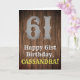 This country look and American Wild West inspired birthday greeting card design features a large rustic inspired number "61", the message "Happy 61st Birthday,", a personalized name, and a faux/imitation wood grain inspired style pattern background. The inside has a customized birthday greeting message, or could perhaps be cleared and left blank if a message is to be written by hand instead. An editable birthday greeting card like this might be sent in celebration of somebody’s sixty-first birthday. [~Z0000469]