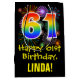 This colourful, fun, and exciting birthday themed gift bag design features a large number "61" with a rainbow spectrum gradient inspired pattern, along with the message "Happy 61st Birthday,", and a customizable recipient name. It also features a colourful background pattern inspired by the look of bursting celebratory fireworks. A birthday themed gift bag like this might be a fun way to wrap a gift or present being given to somebody who is celebrating their 61st birthday. [~Z0000509]