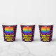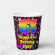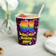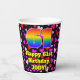 This joyful and colorful birthday-themed paper cup design features a large number “61” having a rainbow spectrum gradient inspired pattern. It also features the message “Happy 61st Birthday,”, and a customizable name. The background features a pattern of purple, red, and pink heart shapes. Loving, joyful paper cups like this might be fun to have at a birthday party being held to celebrate somebody’s 61st birthday. [~Z0000548]