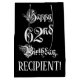 This elaborate and luxurious birthday-themed gift bag design features the message “Happy 62nd Birthday,” in ornate script style text, on a black coloured background. It also features a custom recipient name. An elegant birthday themed gift-bag like this might be a respectable way to wrap a gift or present being given to somebody who is celebrating their 62nd birthday. [~Z0000557]
