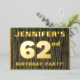 The front of this bold sixty-second birthday celebration foil invitation card features a personalized name, a large number “62nd”, the message “BIRTHDAY PARTY!”, and a border, all in foil. The background of the front features a rustic, yet sophisticated, faux wood grain look inspired pattern. The back features personalized details about the event, such as the date, time, place, and any other useful information. Editable invitations like these might be used to invite guests to a birthday party/gathering being held in celebration of somebody’s 62nd birthday. [~Z0000598]