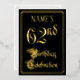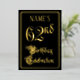 The front of this luxurious, elegant, foil sixty-second birthday party/celebration invitation design features the message “62nd Birthday Celebration” in ornate script-style text. It also features an editable name. The background of the front is coloured black by default (although it can be customized to a different colour). The back features personalized details about the event, such as the date, time, location, and any other relevant information. Ornate, fancy, editable invitations like these might be used to invite guests to a birthday celebration/party being held to celebrate somebody’s 62nd birthday. [~Z0000589]
