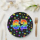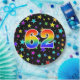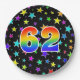 This fun, cheerful, and colourful paper plate design features a large number "62" containing a rainbow spectrum gradient inspired pattern colouring. The background features a colourful star shapes pattern. Fun paper plates like this might be used at a party being held to celebrate somebody’s 62nd birthday, or a couple’s sixty second anniversary, or some other 62nd event. [~Z0000493]