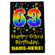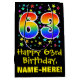 This vibrant, exciting, and colourful birthday themed gift bag design features a large number "63" with a rainbow spectrum gradient style pattern, along with the message "Happy 63rd Birthday,", and a personalized recipient name. It also has a colourful background pattern featuring star shapes of various sizes. A giftbag like this might be used when giving a gift or present in honour of somebody’s sixty third birthday. [~Z0000510]