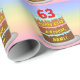 this joyful and upbeat birthday-themed wrapping paper design features a cartoon-style depiction of a three-tier birthday cake having numeral-shaped candles on top showing the number “63“, along with the message “HAPPY 63RD BIRTHDAY,”, and a personalized recipient name. The background has a multicolored pastel rainbow spectrum inspired gradient pattern. Birthday themed wrapping paper like this might be a fun way to wrap a gift or present being given to celebrate somebody’s sixty third birthday. [~Z0000622]