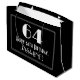 This 1920s-1930s look inspired vintage style birthday-themed gift bag design features a large art deco style inspired number "64", the message "Happy 64th Birthday,", a personalized name, and a border pattern consisting of thin lines. It also has a black-coloured background. A gift bag like this might be used when wrapping gifts being given to somebody in celebration of their 64th birthday. [~Z0000496]
