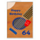 64th Birthday card for someone who loves the guitar. A close-up of a guitar with a plectrum tucked into the strings. On the plectrum are the words 'You Rock'. A birthday card for a musician who loves the guitar.