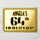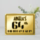 The front of this luxurious and 1920s-1930s era style inspired sixty-fourth birthday celebration/party foil invitation card design features a customizable name, an art deco look inspired number “64th”, the message “BIRTHDAY PARTY”, and a border pattern consisting of lines. The back features personalized details about the event, such as the location/venue, date, time, and any other information that may be useful. Luxurious, stylish, personalized invitations like these might be used to invite guests to a birthday party being held to honour somebody’s 64th birthday. [~Z0000606]