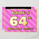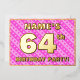 The front of this joyful sixty-fourth birthday celebration/party foil invitation card design features a customizable name, a large number “64th”, the message “BIRTHDAY PARTY!”, and a border. The background of the front has a fun pattern with dark pink and light pink stripes and heart shapes. The back features personalized details about the event, such as the date, time, venue, and any other important information. Customized invitations like these might be a fun way to invite attendees/guests to a birthday gathering being held to honour somebody’s 64th birthday. [~Z0000603]