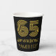 This 1920s-1930s style inspired and vintage style birthday paper cup design features a large art deco inspired look number “65”, along with the birthday greeting message “Happy 65th Birthday,” and a custom name. The background is coloured black. Paper cups like this might be used at a party for somebody who is celebrating their sixty fifth birthday. [~Z0000546]