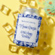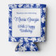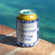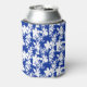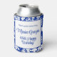 Elegant, chic design featuring a beautiful and modern white floral pattern on azure blue. Delicate blue frame and elegant fonts for birthday party details and customization for can cooler, created as a fun and useful party supply and favour gift for your guests.