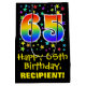 This vibrant, colourful, and exciting birthday-themed gift bag design features a large number "65" with a rainbow spectrum gradient style pattern, along with the message "Happy 65th Birthday,", and a customizable recipient name. It also has a background pattern featuring star shapes of various sizes and colours. A gift bag like this might be used when wrapping gifts being given to somebody in celebration of their sixty fifth birthday. [~Z0000510]