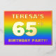 The front of this fun and vibrant sixty-fifth birthday celebration foil invitation card design features a personalized name, a large number “65th”, the message “BIRTHDAY PARTY!”, and a border. The background of the front has a joyful, multicolored, rainbow spectrum inspired gradient pattern. The back features personalized details about the event, such as the date, time, place, and any other information that may be relevant. Customizable invitations like these might be a fun way to invite guests to a birthday party/gathering being held to honor somebody’s 65th birthday. [~Z0000599]