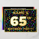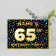 The front of this joyful sixty-fifth birthday celebration/party foil invitation card design features a customizable name, a large number “65th”, the message “BIRTHDAY PARTY!”, and a border. The background of the front has an exciting, multicolored star shapes pattern. The back features personalized details about the event, such as the date, time, place/venue, and any other information that may be relevant. Customizable invitations like these might be a fun way to invite guests/attendees to a birthday gathering/party being held to celebrate somebody’s 65th birthday. [~Z0000600]