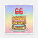 This upbeat and fun birthday paper napkin design features a cartoon-style depiction of a three-tier birthday cake having numeral-shaped candles on top showing the number “66“, along with the message “HAPPY 66TH BIRTHDAY,”, and a customizable recipient name. The background features a multi-colour pastel rainbow spectrum inspired gradient pattern. Paper napkins like these might be used when celebrating somebody’s sixty sixth birthday. [~Z0000623]