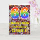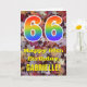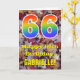 The front of this colourful, nature-inspired, and rustic birthday greeting card design features a large number "66" with a rainbow spectrum gradient inspired pattern, along with the message "Happy 66th Birthday,", and a personalized name. The front features a background depicting rustic fallen autumn leaves. The inside features a customized birthday greeting message, or could perhaps be cleared and left blank if a message is to be written by hand instead. A birthday card like this might be a fun way to send birthday wishes to somebody who is celebrating their sixty sixth birthday. [~Z0000384]