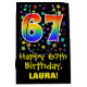 This exciting, fun, and vibrant birthday gift bag design features a large number "67" with a rainbow spectrum gradient style pattern, along with the message "Happy 67th Birthday,", and a customizable recipient name. It also has a colourful background pattern featuring star shapes of various sizes. A birthday themed gift bag like this might be a fun way to wrap a gift or present being given to celebrate somebody’s 67th birthday. [~Z0000510]