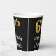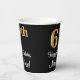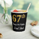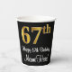 This elegant, luxurious, and sophisticated birthday-themed paper cup design features a large ordinal number “67th” having a faux/imitation gold-inspired look, along with the birthday greeting message “Happy 67th Birthday,” and a customizable name in a script-style font. The background is coloured black. Elegant birthday themed paper cups like this might be used at a party for somebody who is celebrating their 67th birthday. [~Z0000538]