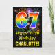 The front of this fun, colourful, and exciting birthday themed greeting card design features a large number "67" with a rainbow spectrum gradient inspired pattern, along with the message "Happy 67th Birthday,", and an editable recipient name. The front additionally has a colourful background pattern inspired by the appearance of bursting celebratory fireworks. The inside features a customized birthday greeting message, or could perhaps be cleared and left blank if a message is to be written by hand instead. A customizable birthday card like this might be a fun way to acknowledge somebody’s sixty seventh birthday. [~Z0000442]