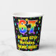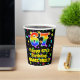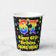 This fun and colourful birthday paper cup design features a large number “67” with a rainbow spectrum gradient inspired pattern, along with the message “Happy 67th Birthday,”, and a personalized name. The background features a multicolored pattern featuring many star shapes with different colours and sizes. Colourful, vibrant paper cups like this might be fun to use at a birthday party/celebration being held in celebration of somebody’s sixty seventh birthday. [~Z0000540]