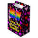 This happy and fun birthday gift bag design features a large number “67” with a rainbow spectrum gradient inspired pattern, along with the message “Happy 67th Birthday,”, and a personalized name. The background features a pattern of pink, purple, and red heart shapes of various sizes. A birthday themed gift bag like this might be used when giving a gift or present in celebration of somebody’s sixty seventh birthday. [~Z0000551]