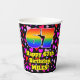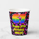 This happy and cheerful birthday-themed paper cup design features a large number “67” having a rainbow spectrum gradient inspired pattern. It also features the message “Happy 67th Birthday,”, and a customizable name. The background features a pattern of purple, pink, and red heart shapes. Loving, joyful paper cups like this might be fun to have at a birthday celebration/party being held in celebration of somebody’s sixty seventh birthday. [~Z0000548]