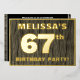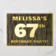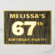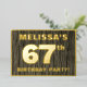 The front of this bold sixty-seventh birthday celebration foil invitation card features a customizable name, a large number “67th”, the message “BIRTHDAY PARTY!”, and a border, all in foil. The background of the front features a rustic, yet sophisticated, faux wood grain look inspired pattern. The back features personalized details about the event, such as the date, time, venue/location, and any other useful information. Editable invitations like these might be used to invite guests to a birthday party being held to celebrate somebody’s 67th birthday. [~Z0000598]
