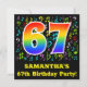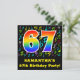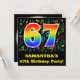 The front of this fun, exciting, and vibrant birthday party invitation design features a large number "67" having a rainbow spectrum gradient inspired pattern. It also features a personalized name and the message "67th Birthday Party!". Part of the background features a fun pattern of various music notes and symbols having a variety of colours and sizes. The back features customized details pertaining to the event that the potential guests are being invited to. Joyful, customized birthday party invitation cards like this might be sent to potential guests of a celebratory gathering being held to honour a musician’s, a song composer’s, a singer’s, or somebody else’s 67th birthday. [~Z0000427]