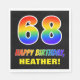 This cheerful, fun, and colourful birthday-themed paper napkin design features a large number "68" and the message "HAPPY BIRTHDAY,", both coloured with a rainbow spectrum gradient inspired pattern, along with a bold yellow customizable recipient name. The background is coloured black. Fun, customized paper napkins like this might be used at a birthday party being held to celebrate somebody’s sixty-eighth birthday. [~Z0000476]