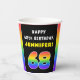 This fun and upbeat birthday themed paper cup design features the number “68“ having a multicolored rainbow spectrum inspired gradient pattern, along with the message “HAPPY 68th BIRTHDAY,”, and a personalized recipient name. Cheerful paper cups like this might be fun to use at a birthday party in honour of somebody’s 68th birthday. [~Z0000639]