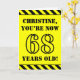 The front of this attention-grabbing and bold birthday-themed greeting card design features a custom name and the message "YOU’RE NOW 68 YEARS OLD!" in black stencil look text on a yellow coloured background. There is also an eye-catching black and yellow striped pattern at the top and bottom edges of the front. The inside features a custom birthday greeting message, or could perhaps be cleared and left blank if a message is to be written by hand instead. A personalized birthday card like this might be a fun way to acknowledge somebody’s sixty eighth birthday. [~Z0000413]