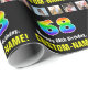 This bold and cheerful birthday-themed wrapping paper design features a large number “68“ having a multicolor rainbow spectrum inspired gradient pattern, along with the message “Happy 68th Birthday,“ and a personalized recipient name. There are also photos that can be personalized, perhaps with photos of the recipient, the recipient’s family and friends, and/or the sender(s) of the gift. Joyful wrapping paper like this might be used when wrapping presents being given to somebody in celebration of their sixty-eighth birthday. (Photography © Storytree Studios, Stanford, CA.) [~Z0000670]