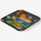 This upbeat and vibrant birthday-themed paper plate design features a large number “69” having a colourful rainbow spectrum inspired gradient pattern. It also features the message “HAPPY 69th BIRTHDAY,”, and a customizable name. The background of the front has a bold, colourful pattern that resembles bursting celebratory fireworks. Birthday themed paper plates like this might be used at a birthday party celebrating somebody’s sixty ninth birthday. [~Z0000604]