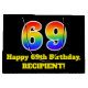 This fun and vibrant birthday-themed gift bag design features a large number "69" with a rainbow spectrum gradient inspired pattern, along with the message "Happy 69th Birthday,", and a personalized name. The background is coloured black. A colourful birthday themed gift-bag like this might be a fun way to wrap a gift or present being given to somebody who is celebrating their 69th birthday. [~Z0000521]