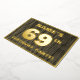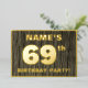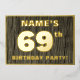 The front of this bold sixty-ninth birthday party/celebration foil invitation card features a custom name, a large number “69th”, the message “BIRTHDAY PARTY!”, and a border, all in foil. There is a rustic, yet elegant, faux wood grain appearance inspired pattern for the background of the front. The back features personalized details about the event, such as the date, time, place/venue, and any other information that may be important. Customized invitations like these might be used to invite attendees to a birthday party being held to celebrate somebody’s 69th birthday. [~Z0000598]