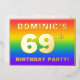 The front of this upbeat sixty-ninth birthday party foil invitation card design features a custom name, a large number “69th”, the message “BIRTHDAY PARTY!”, and a border. The background of the front features a fun, colorful, rainbow spectrum inspired gradient pattern. The back features personalized details about the event, such as the date, time, location/venue, and any other important information. Customizable invitations like these might be a fun way to invite guests to a birthday party being held in celebration of somebody’s 69th birthday. [~Z0000599]