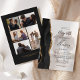 This elegant wedding design features a vertical photo of the couple softened with a white screen to highlight the text overlay. The left-hand edge features a black watercolor agate border trimmed with faux gold glitter. The customizable black text combines handwriting, copperplate and italic fonts. The reverse side features a matching black and gold agate edge. The reverse side provides spaces for 5 additional photos (3 horizontal 1 square and 1 vertical) and room for your wedding website URL or other brief message.