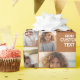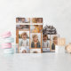 6 photos in an uneven pattern surround an opening for three lines of text. Use 2 square cropped photos and 4 vertical photos to make this work!