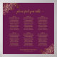 This 6 table seating chart is both simple and elegant with gold text on a magenta or cassis purple colored background and lacy floral filigree in the corners. The title reads "please find your table" in an elegant script calligraphy. Sophisticated and chic. Includes table assignments for 60 guests with 10 seats per table.