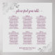 This 6 table seating chart is both simple and elegant with magenta or cassis purple text on a light grey background and lacy silver faux foil floral filigree in the corners. The title reads "please find your table" in an elegant script calligraphy. Sophisticated and chic. Includes table assignments for 60 guests with 10 seats per table.
